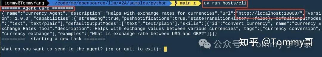 4、再通过"uv run hosts/cli"启动客户端,示例中的客户端会主动发现并识别通过A2A协议开发的Agent