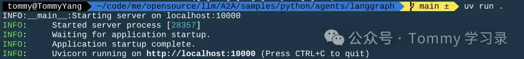 5、回到langgraph的目录,会发现多了通过A2A协议开发的langgraph Agent下多了一行日志,表明当前Agent被客户端获取到了。