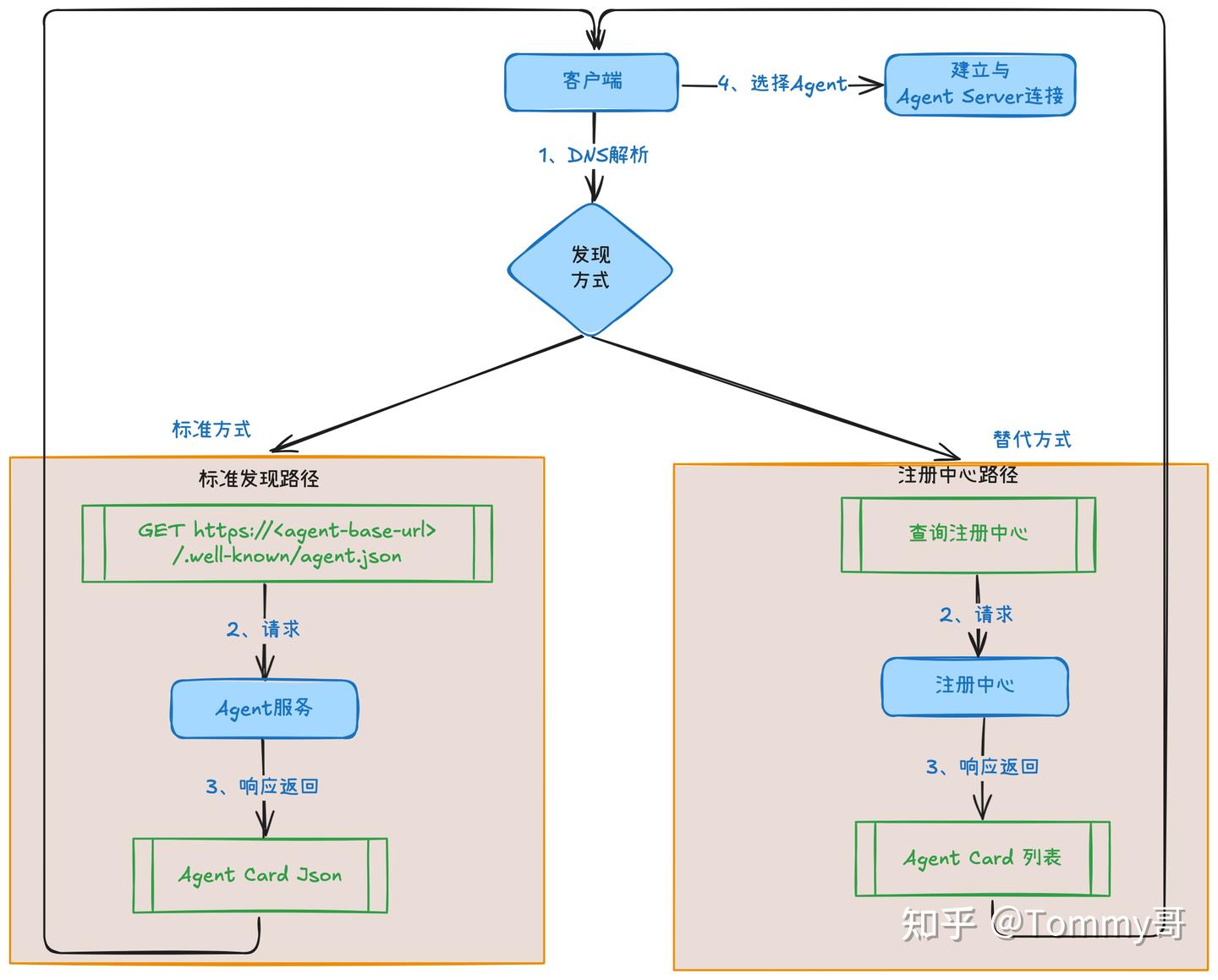 2、其他方式: 也可以通过私有注册中心 (Registry)、Agent 目录 (Catalog) 或市场 (Marketplace) 来发现和管理 Agent Card。